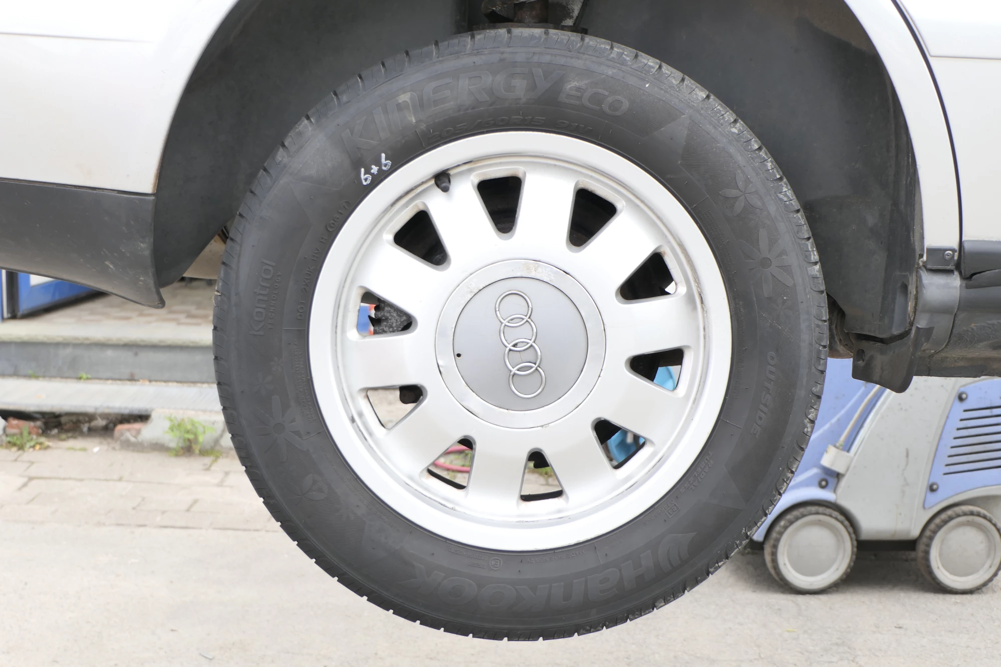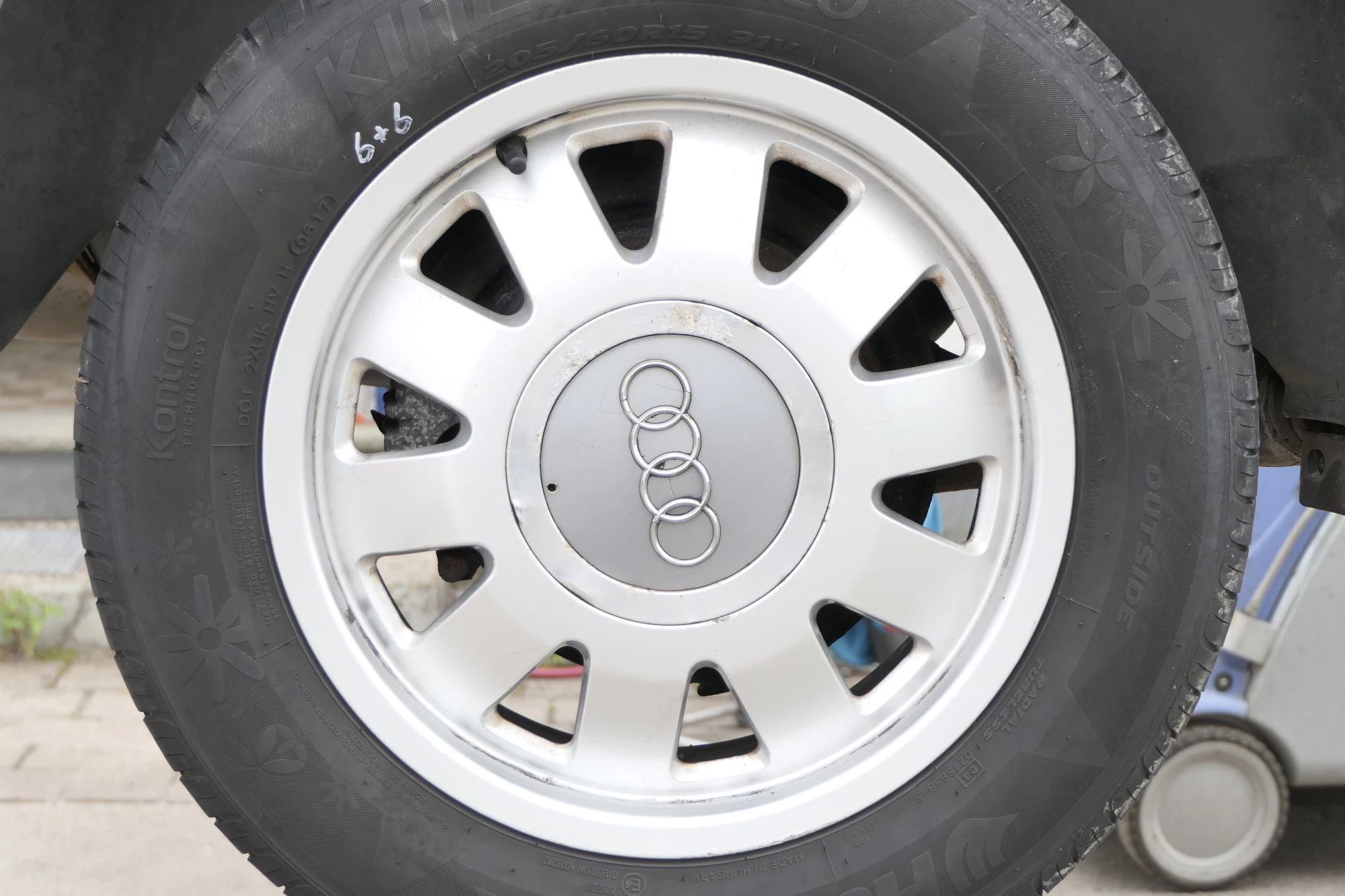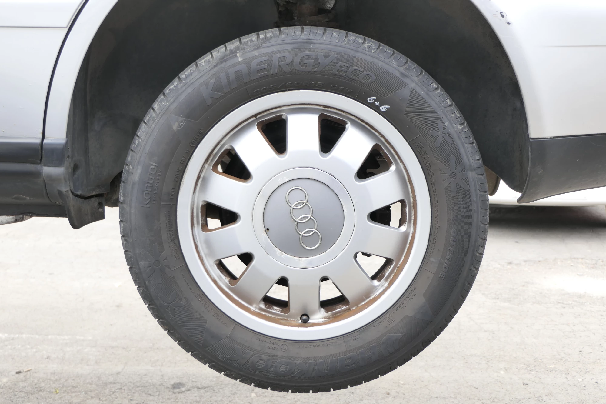Angeboten wird ein Satz Alufelgen mit Hankook Reifen mit 2x ca. 6mm Profil, Herstellung 0816 und 2x ca. 4-5mm Profil, Herstellung 0617, auf Felge 6,5Jx15H2 ET45, aus einem Audi A6 4B Bj. 2002.