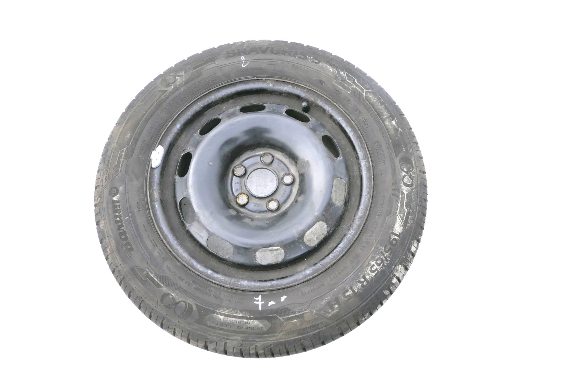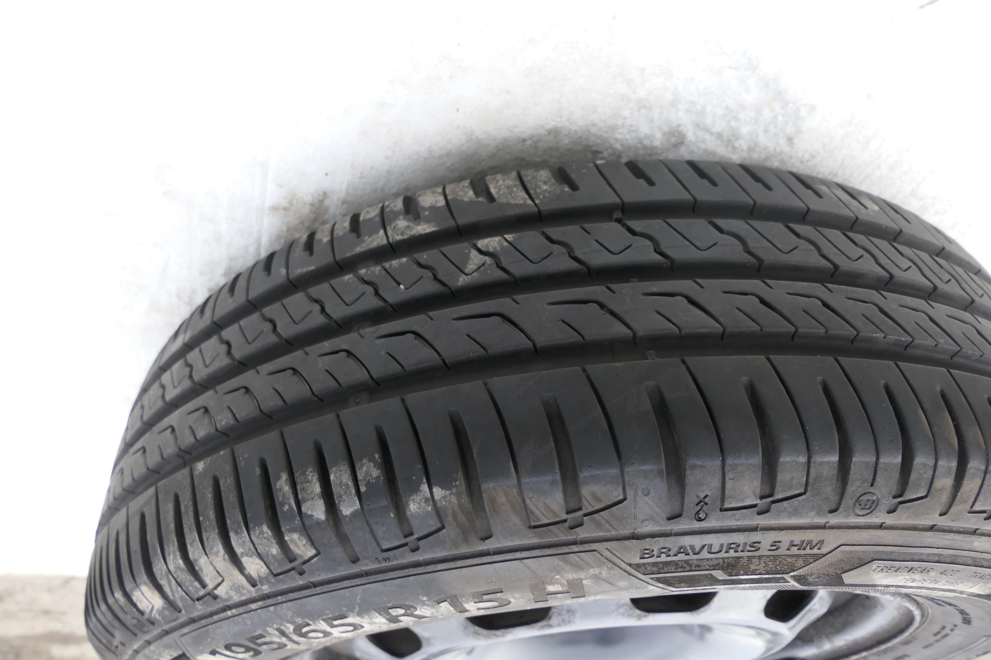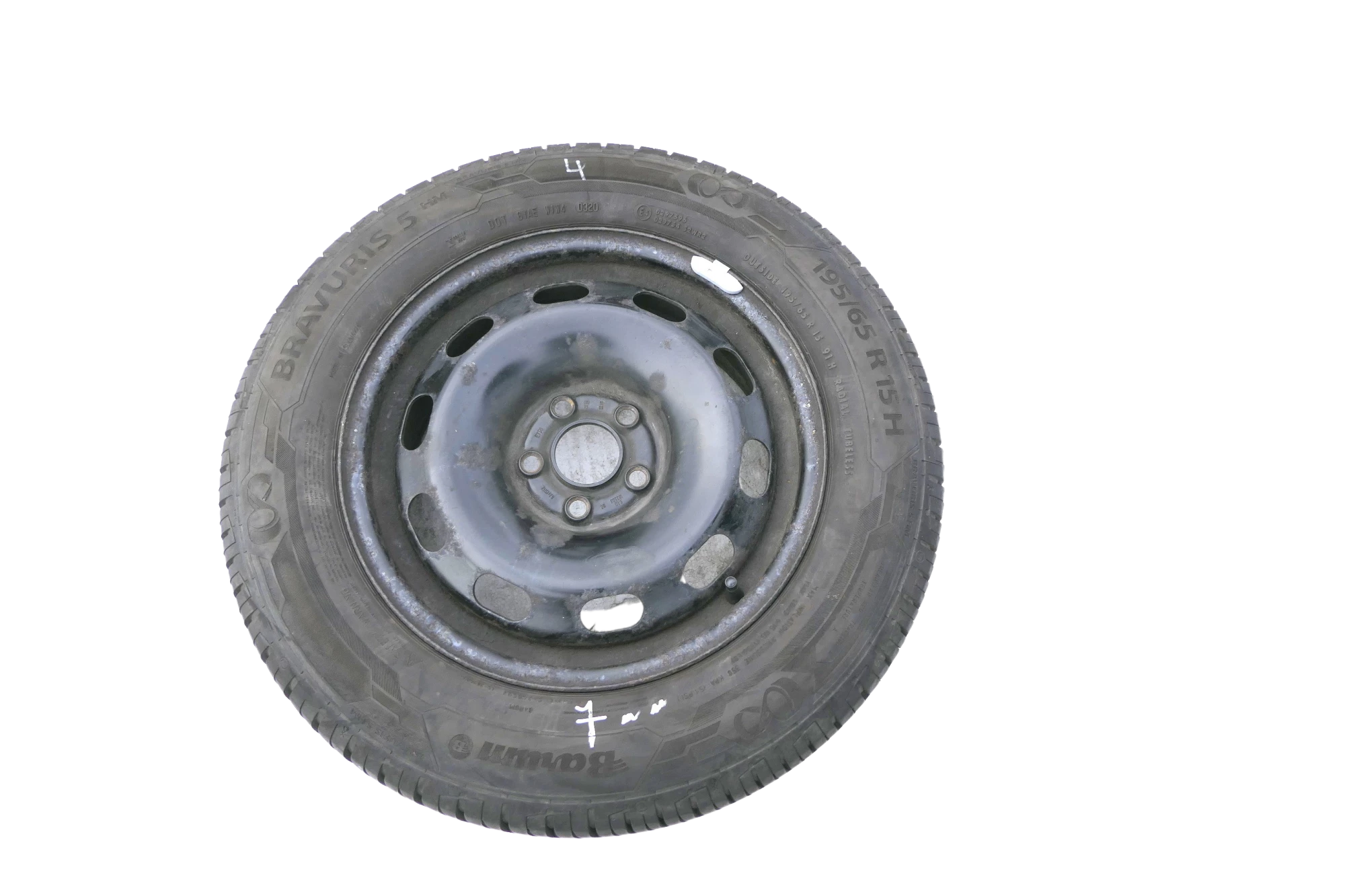 Angeboten wird ein Satz Sommerreifen mit 2x ca. 7mm Profil, Herstellung 0320 von 2x Barum und 2x Bridgestone mit ca. 3-5mm Profil Herstellung 0117, 195/65 R15 91T auf Felge 6jx15H2 ET38 original VW 1J0601027H aus einem VW Golf 4 Bj. 2000.