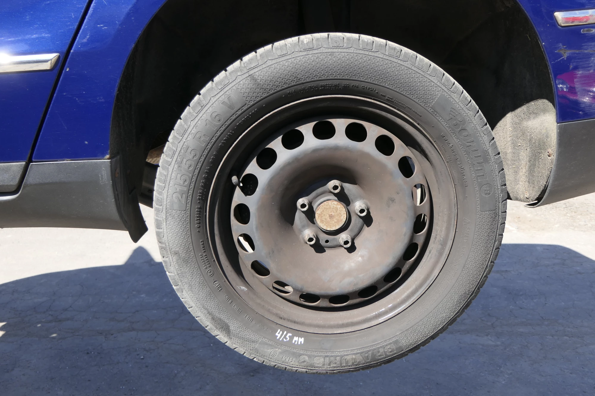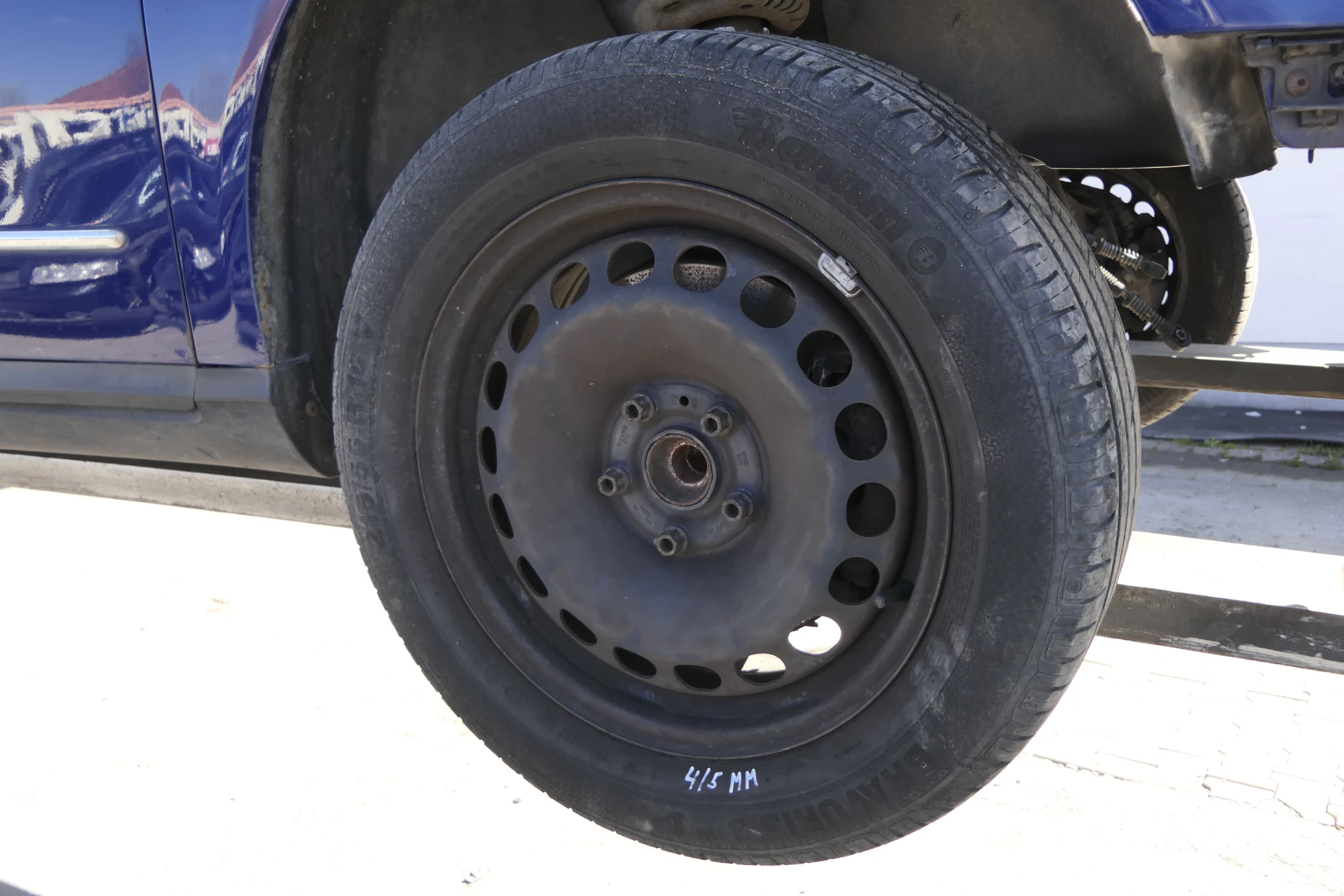 Angeboten wird ein Satz Sommerreifen Barum mit 4-5mm Profil, Herstellung 1317 auf Felge 6,5jx16H2 ET42 aus einem VW Passat 3C Bj. 2010.