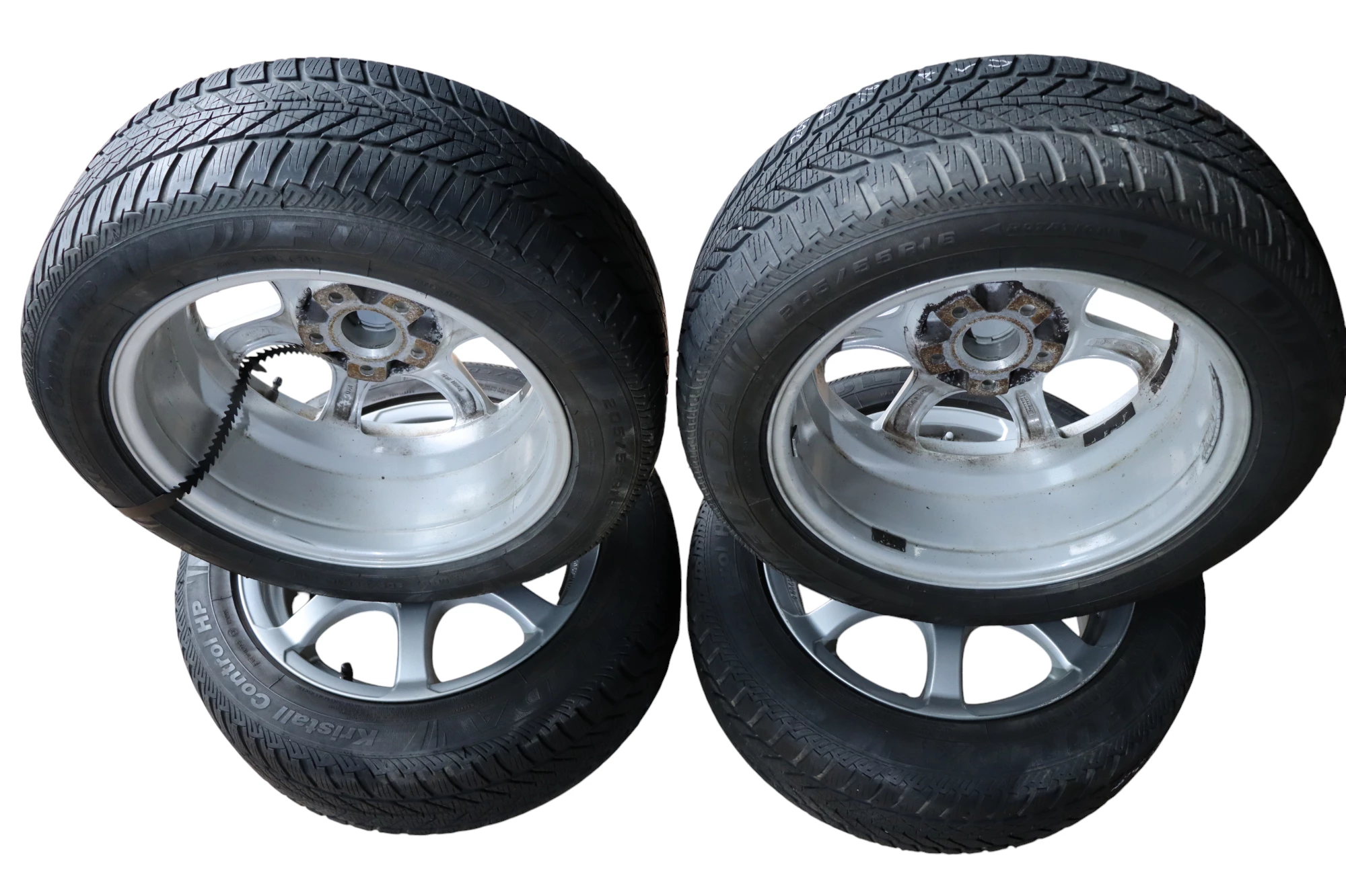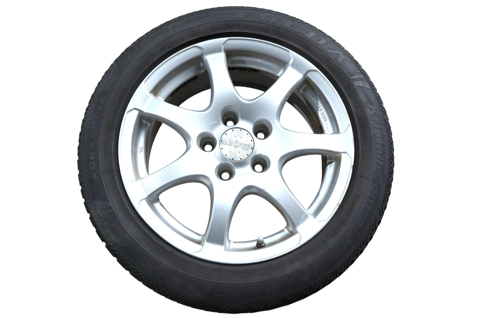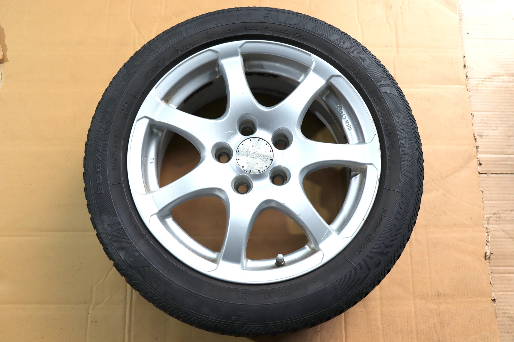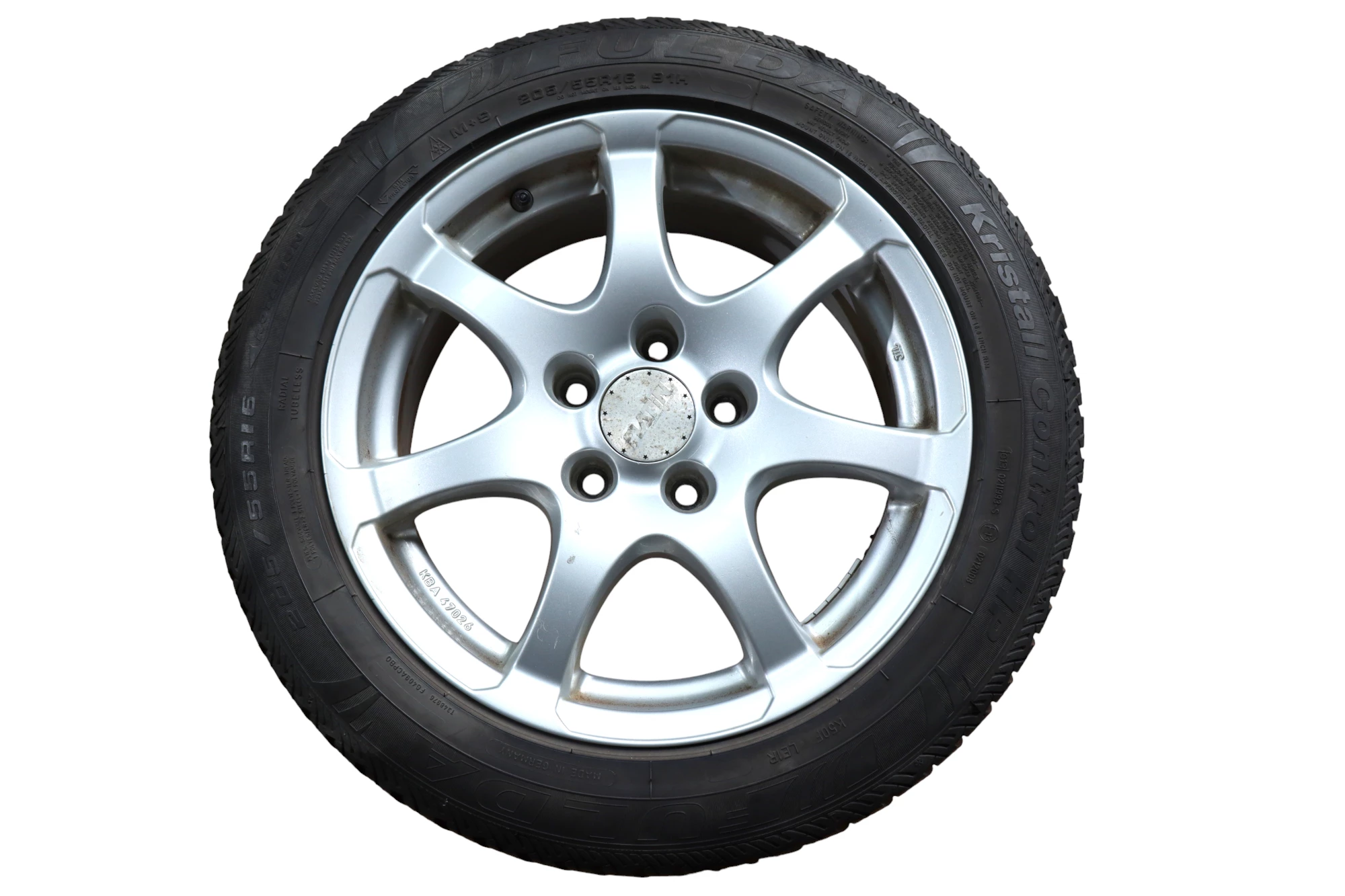 Angeboten wird ein Satz Alufelgen mit Winterreifen, Hersteller Fulda, Herstellung 2612 mit ca.4-5 mm Profil je Reifen auf Anzio Felge KBA 47026, 7jx16H2 ET42 aus einem VW Golf.